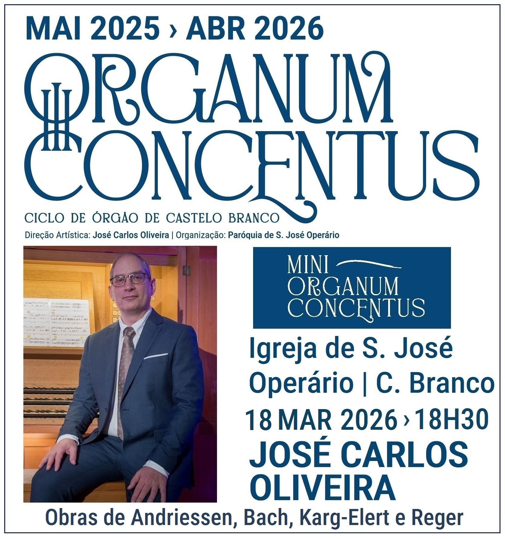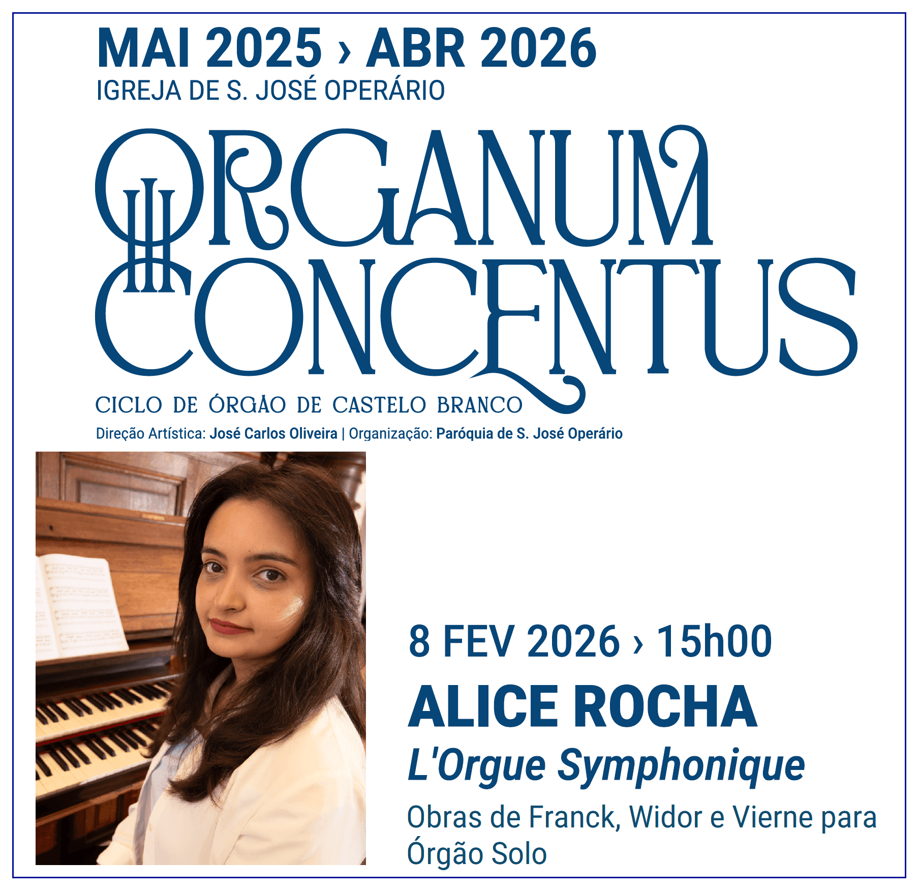 A Paróquia de São José Operário promove desde 01 de maio de 2023 um ciclo anual de concertos que visa fomentar o contacto e divulgação de música de elevada qualidade composta para órgão solo ou para duos deste instrumento com solistas instrumentais ou vocais: o Organum Concentus – Ciclo de Órgão de Castelo Branco. Nesta terceira edição, a realizar entre maio de 2025 e abril de 2026, pretende-se continuar os objetivos essenciais propostos nas anteriores: permitir à comunidade albicastrense ter acesso a um repertório organístico relevante, propiciado pela existência do instrumento de 29 registos, distribuídos por dois manuais e pedaleira, instalado na Igreja Paroquial de São José Operário em 2013, no qual se pode realizar um leque variado de obras de todas as épocas e, simultaneamente, ser uma plataforma destinada à divulgação do trabalho realizado por organistas portugueses, de Norte a Sul do país. Por outro lado, nesta edição pretende-se alargar a atividade desenvolvida nos dois ciclos anteriores ao instrumento histórico do século XVIII situado na Sé CoCatedral de Castelo Branco. A nível da tipologia de concertos, procurou-se: i) manter um equilíbrio entre concertos a solo e concertos a duo; ii) inserir, tal como nas edições anteriores, um concerto didático especialmente dirigido a crianças dos primeiros ciclos de escolaridade do ensino básico; iii) alargar o tipologia através da inserção de um concerto dedicado totalmente a improvisação e vários concertos em que a improvisação estará presente; iv) dedicar pela primeira vez um concerto a repertório para Órgão a quatro mãos; v) realizar um programa paralelo de miniconcertos semanais alternando entre os dois instrumentos disponíveis na cidade. No link abaixo poderá conhecer a programação deste evento e as biografias dos intérpretes que nele tomarão parte.