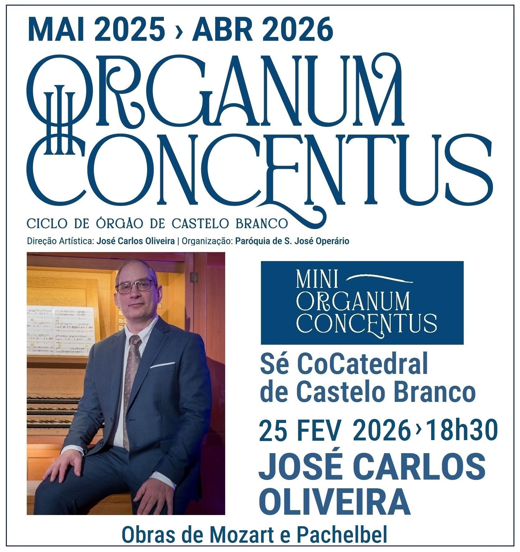 A Paróquia de São José Operário promove desde 01 de maio de 2023 um ciclo anual de concertos que visa fomentar o contacto e divulgação de música de elevada qualidade composta para órgão solo ou para duos deste instrumento com solistas instrumentais ou vocais: o Organum Concentus – Ciclo de Órgão de Castelo Branco. Nesta terceira edição, a realizar entre maio de 2025 e abril de 2026, pretende-se continuar os objetivos essenciais propostos nas anteriores: permitir à comunidade albicastrense ter acesso a um repertório organístico relevante, propiciado pela existência do instrumento de 29 registos, distribuídos por dois manuais e pedaleira, instalado na Igreja Paroquial de São José Operário em 2013, no qual se pode realizar um leque variado de obras de todas as épocas e, simultaneamente, ser uma plataforma destinada à divulgação do trabalho realizado por organistas portugueses, de Norte a Sul do país. Por outro lado, nesta edição pretende-se alargar a atividade desenvolvida nos dois ciclos anteriores ao instrumento histórico do século XVIII situado na Sé CoCatedral de Castelo Branco. A nível da tipologia de concertos, procurou-se: i) manter um equilíbrio entre concertos a solo e concertos a duo; ii) inserir, tal como nas edições anteriores, um concerto didático especialmente dirigido a crianças dos primeiros ciclos de escolaridade do ensino básico; iii) alargar o tipologia através da inserção de um concerto dedicado totalmente a improvisação e vários concertos em que a improvisação estará presente; iv) dedicar pela primeira vez um concerto a repertório para Órgão a quatro mãos; v) realizar um programa paralelo de miniconcertos semanais alternando entre os dois instrumentos disponíveis na cidade. No link abaixo poderá conhecer a programação deste evento e as biografias dos intérpretes que nele tomarão parte.